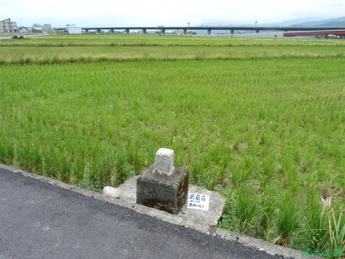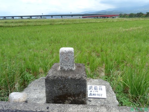 即可見到前方不遠處之排水溝渠對面、路右稻田路旁的【武蘭莊】基石