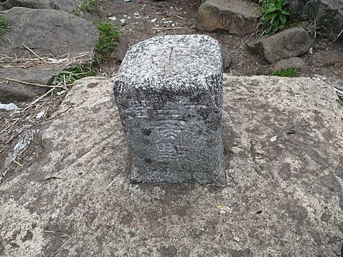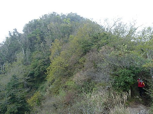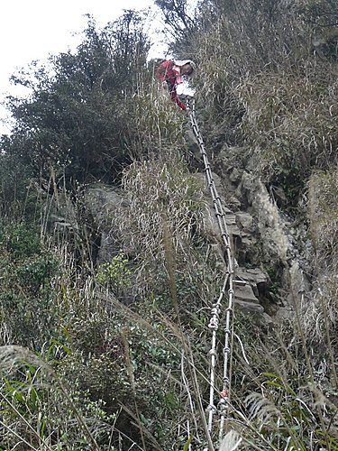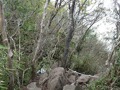 13:22 再一段拉繩陡上後,登頂已幾無視野的加里山頂﹝標高2220公尺、一等三角點﹞