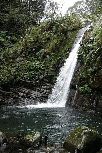 昔日造訪鴛鴦谷瀑布群時,還記得有:「玉女瀑布」、「女人瀑布」、「勇士瀑布」分立各路口的鴛鴦谷瀑布群標示牌,現在由林道口入內起算,已分別喚作:「1號瀑布」、「2號瀑布」、「3號瀑布」;另樹上所釘新的登山指示牌、則分別稱為:「鴛鴦瀑布」、「鰻潭瀑布」、「小瀑布」。幾年前循序造訪瀑布群時,因天候不佳且已向晚,「3號瀑布」僅瀏覽前面的深谷白練激流,未及至濕滑步道之盡頭、而暫時無緣見到隱藏凹陷山壁間的飛瀑懸泉,今日再次於水田山行的的因緣巧合下,相隔數年後、無心插柳柳成蔭,也終歸得見其廬山真面目矣。