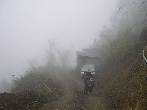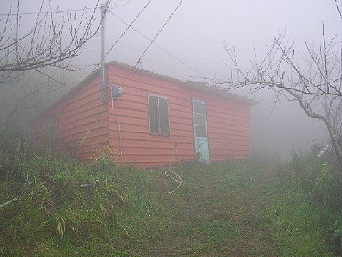 <09:03>濃霧中隱約見到路左的第一間工寮。
