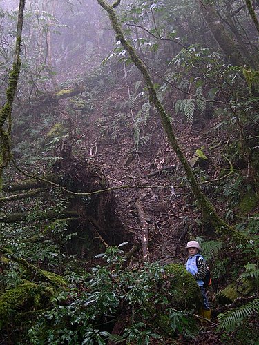 兩支微弱的手電筒燈光下,雨絲不斷飄下來,伴隨著因天黑而顯得更濃密的霧氣中,摸索著在巨石磊磊的乾溝中,手牽著手溯乾溝而上。短短幾公尺的路,走了好像一世紀那麼久,跨上大石,攀過倒木,終於在沒有任何路條的懷疑中,找不到路可以再繼續前進了。