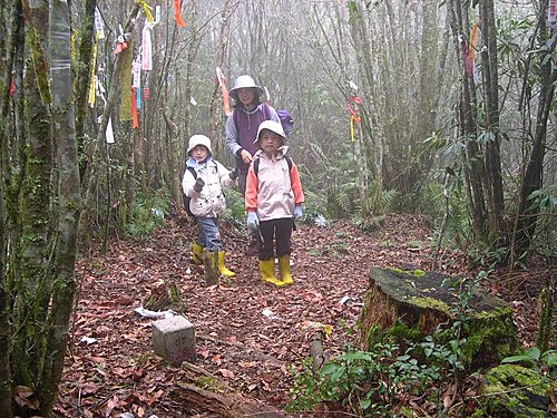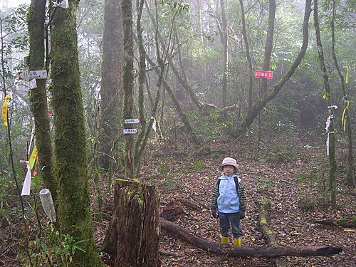 在既憂心又傷腦筋的時候,小兒子竟然在這令人瑟縮的寒風細雨中鼓勵哥哥:「我們不要哭喔,不要讓爸爸更擔心了!」聽來真是令人感動又是自責。母子三人先就地於小溪邊等候,我順著水管於過溪處左轉順溪流方向而走,走不到10幾公尺,路順勢一個小落差陡下,就見到下方第一個路條。此時心中真是欣喜萬分,連忙回頭招呼全部人馬過來。
