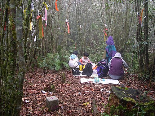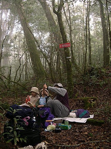 樹林圍繞的山頂,毫無展望,僅有一小塊休息地。約20分後媽媽也帶著小兒子登頂了。此時午餐時刻已到,不吃東西也不行,趕緊煮麵補充體力。
