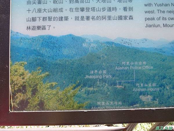 三、對高岳:標高2458公尺,山頂建有對高亭,立有阿里山林補39號基石。「對高岳」因為正對著日本人早期稱呼的「新高山」(玉山),所以稱為「對高岳」。