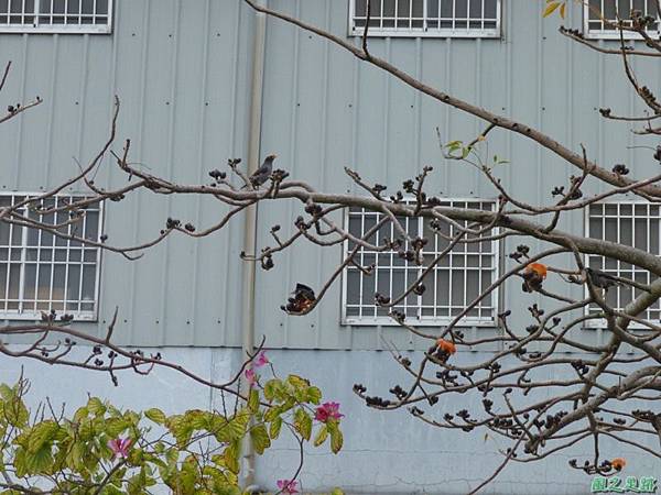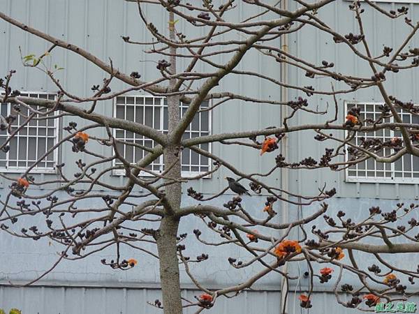 剛好左邊一株木棉樹飛來一隻八哥鳥駐足枝幹上