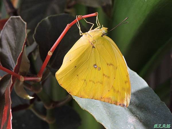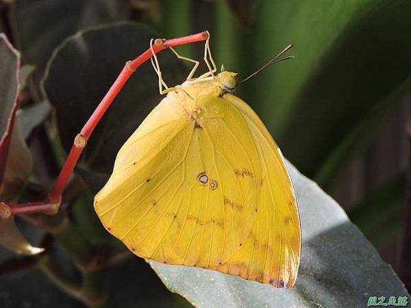 淡黃蝶(黃斑型),黃色,翅腹面具鑲褐色的白斑,雌蝶在寄主嫩芽處產卵。